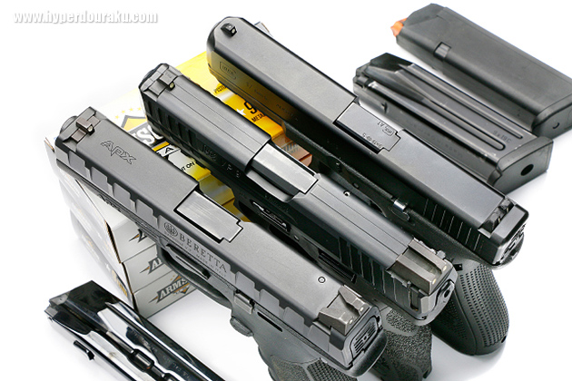 左から「ベレッタ APX」、「H&K VP9」、「グロック G17 Gen5」。自衛隊の新制式採用拳銃選考のため平成29年度予算で購入された3種類で、ナントCQB GUAMには全て揃っています♪