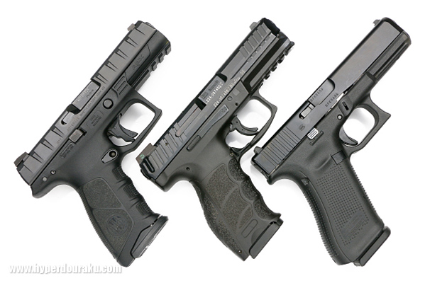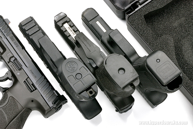 それぞれのスライドの比較。同じ9×19mmルガー弾を撃ち出すストライカー式オートマチックですが、特に角の落とし方や仕上げの差なのか、随分と印象が違います。VP9が一番細身に見えますね。