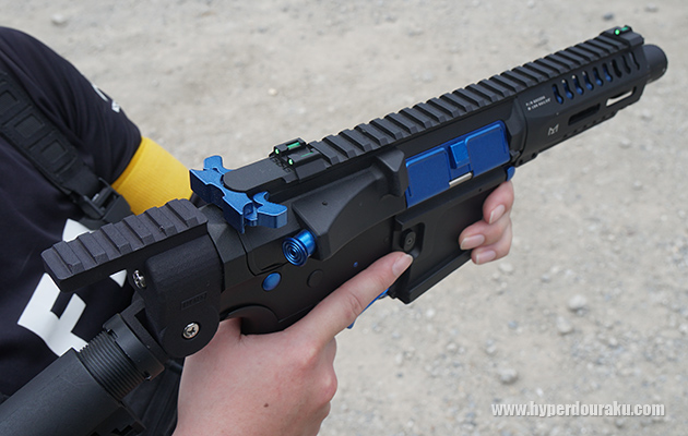 G&Gの電動ガン、GC16プレデターがベースだよ。PERNの電子トリガーユニット、マルイのチャンバーパッキンを組み込んでるね。