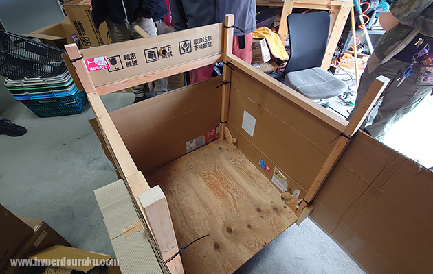 大きなバリケードの移動用台車をベースに組み立てたんだ。この後ろの角棒で押して移動するんだ。