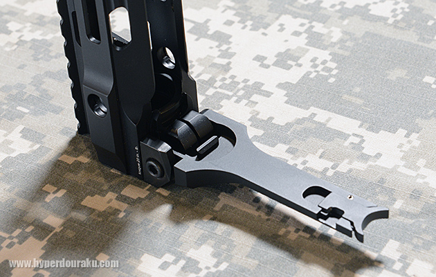 ロックレバーを起こすとバレルナットへの締め付けがフリーになり、簡単にハンドガードを取り外すことができる。レバーの素材は7075-T6アルミニウム製。