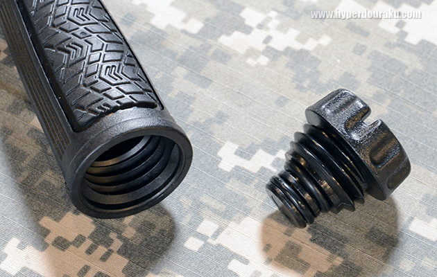 グリップ底部のダイヤルキャップを締めこむとレイルに固定するようになっていて、またこのキャップを取り外すと内部のコンパートメントスペースにアクセスできる。