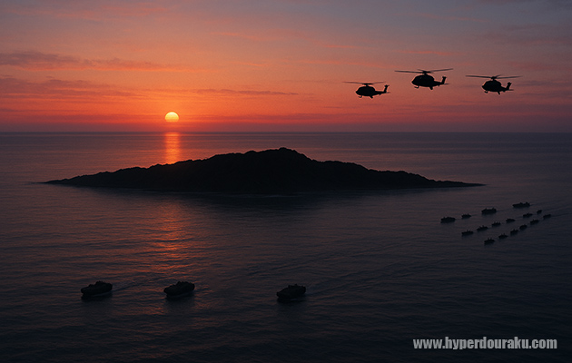 駐屯地簡易レーダーが、海岸線15km沖で敵艦隊を捕捉。空自のF-35Aが制空権を確保し、海自「あたご」が敵艦隊を封鎖するが、上陸用舟艇10隻、ZBD-05B 3両、Z-20 3機が防衛網を突破し、10km圏内に侵入。MRCVを中心とする陸自が迎撃態勢に入る。