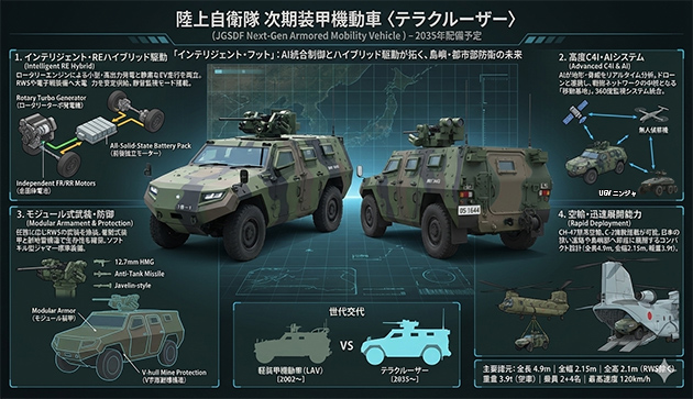 テラクルーザーは、日本の地理特性に最適化された軽量・コンパクトな車体に、インテリジェント・ハイブリッド駆動とAI技術を融合した次世代のインテリジェント・フットである。従来の軽装甲機動車(LAV)と高機動車の後継という枠を超え、島嶼防衛やゲリラ対処、災害派遣といった多様な任務に柔軟に対応する、未来の戦術プラットフォームの姿をここに提示する。