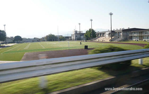基地内には学校もある。いかにもアメリカンハイスクールなフットボール場が!