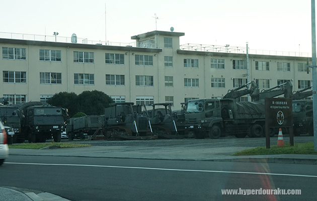 陸上自衛隊の第4施設群の駐車場にトラックやドーザが沢山! 座間基地内には自衛隊も駐屯しているのだ。