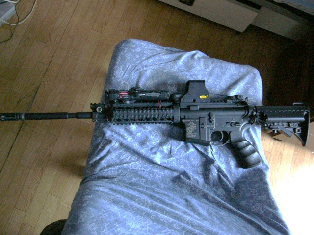 ■エントリー No.A021 ■投稿タイトル:M4SPORTER ■投稿者: 叢 さん ■コメント サバゲーで使用してるM4です。 G&PのメタフレにPDIのスポーターサイズのアウターを入れた物です ゲームではセミオンリーでゲームをしているので内部もセミ仕様。 2年近く使っているので所々ハゲがありますが、1番気に入ってる愛銃です