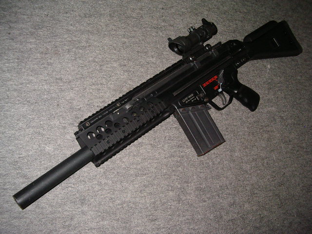 ガワはライラのレイルスリーブSASとノーブランドのG36C用RASをフリーダムアートのSEBONEでタンデム連結(ポン付けw)スリム系のサイレンサーがバレルジャケットを兼ねてます。HK416のエンハンスドスライドストックもありますがバッテリーの問題から固定ストックで運用してます。サバゲでは多用途に使えて便利な銃です^^