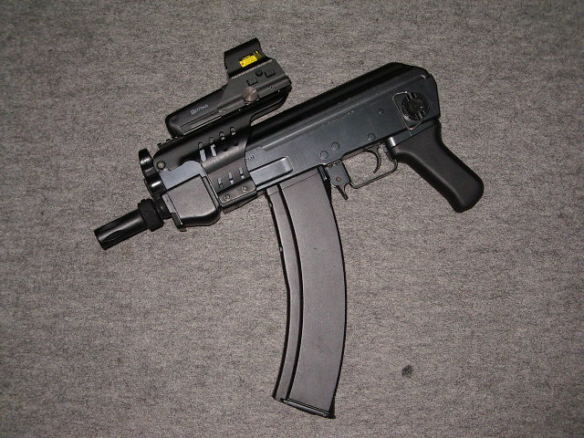 AK47ベースでフロントをノコギリでバッサリ切断してMP5のフロントサイトとハイダー周りを流用してます。バレルはMP5KPDWのものでセクカ3枚ラック3枚7ミリベア11.1Vリポでプチハイサイ仕様です。