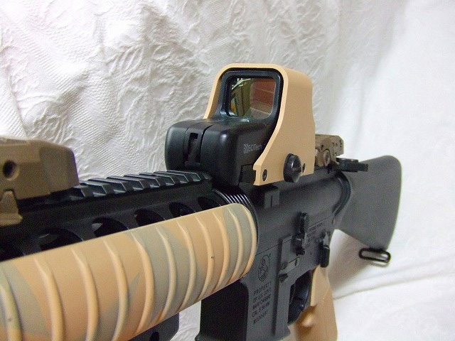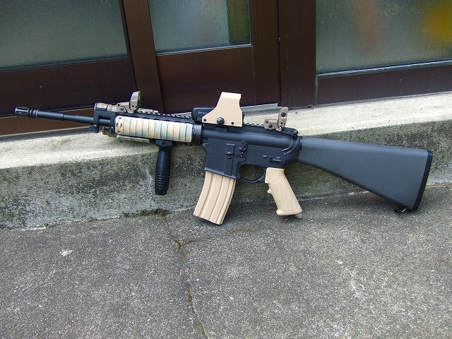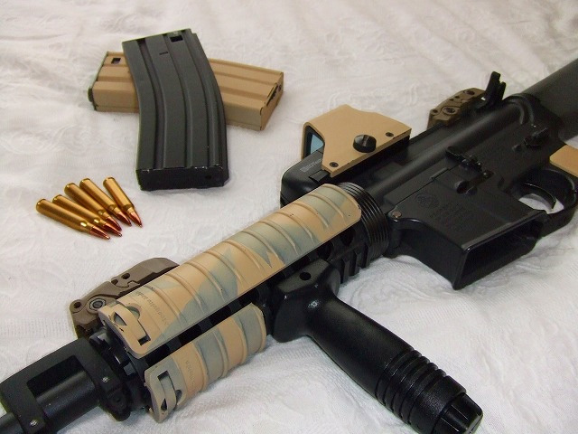 砂漠戦を想定しレイルカバーやグリップ等をTANで塗装しました。室内戦とかはまったく考えていません。