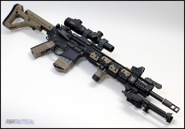 最低限の長さにぶった切ったフォアグリップと、サイドレールに取り付けた近距離用のダットサイト辺りでしょうか。