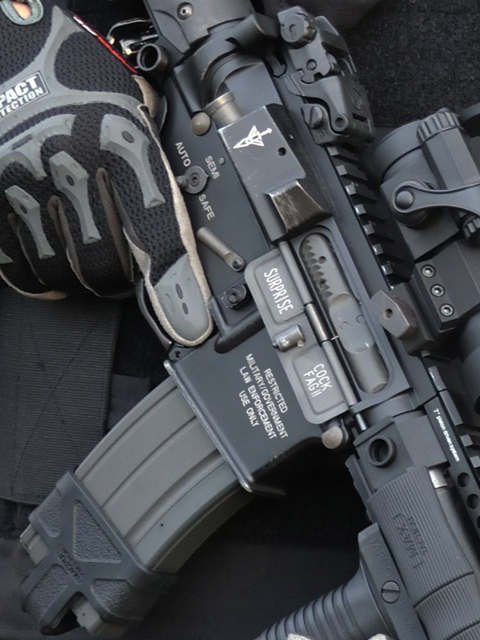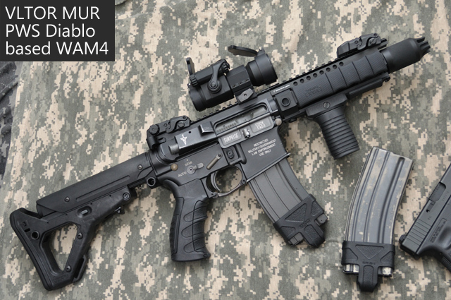 KingArms製VLTOL MUR、Magpul PTS UBRストック、G&P製I.A.グリップ、レールカバーには手触りが気持ちいいMADBULLラバーバンブー、フォアグリップは小振りでもしっかり握れるTAPCO製(実銃用/貰い物)です。