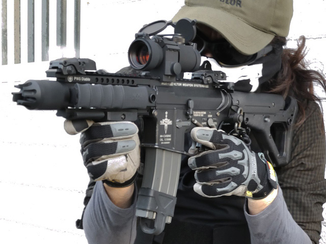 フロントはHoneyBee製PWS Diablo 7inchセット。当初イロモノだと思い完全にスルーしていましたが、価格の安さに惹かれて実銃を調べ始め、「泥水に入れても大丈夫!」「短銃身でも狙撃できる!」とPWSのプロモーションを鵜呑みにして惚れてしまいました。