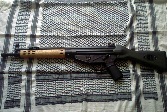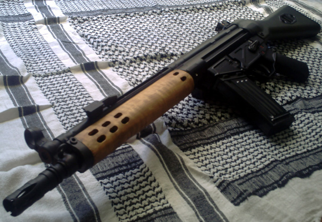ベトナム戦前後の装備としてHK33を持っていましたが、ハンドガードが時代的に合わなかったのと「銃は木と鉄」というこだわりの下、スリムな木製ハンドガードを戦民思想にて作成してもらいました。