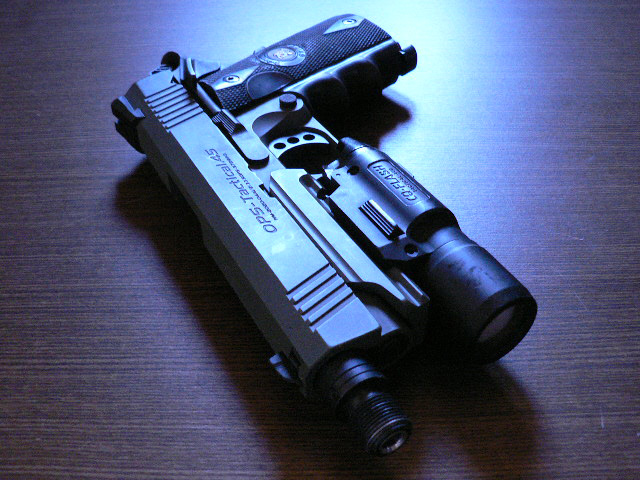 アンダーレイルに付いているのはマルイのCQフラッシュライトですが、機会があればシュアファイアのX300辺りに替えたいなと思っております。