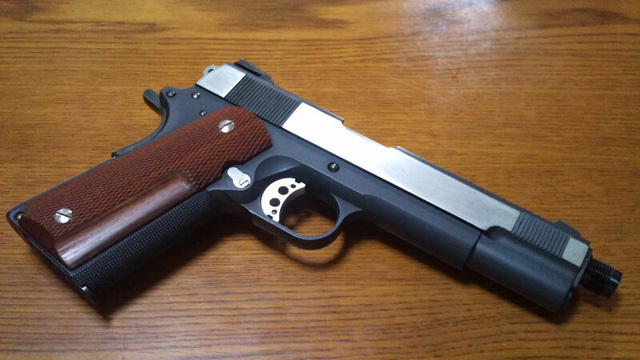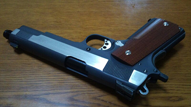 ■投稿タイトル: スネークマッチ ■投稿者:カブト ■コメント マルイのミリガバベースで作りました。フロントセレーションはジャンクのミリガバセレーション部分を切り取って移植し、セーフティー、スライドストップ、ハンマーなどは、ハイキャパのパーツを加工しました。 一番大変だったのは、スライドの塗装でしたが、キャロムのスーパーブライトで、何とか納得出来る色合いになったと思います。
