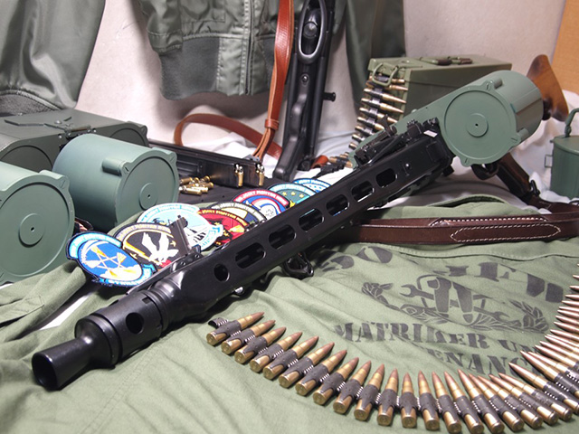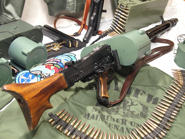 サドルマガジンはアルミ板と塩ビパイプなどから製作、フィードカバーは純正を切断し、アルミ角パイプとアルミ角材・市販のラッチなどでマガジ ンホルダーに改造、マズルブースターは純正をアルミ丸材でカバーを作り延長しました。内部はMG42用ハイサイクルキットを組み込んであります。