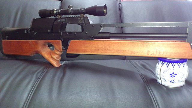 東京マルイP-90TRをベースに、アルミ、木材を利用してWA2000風にしてみました。