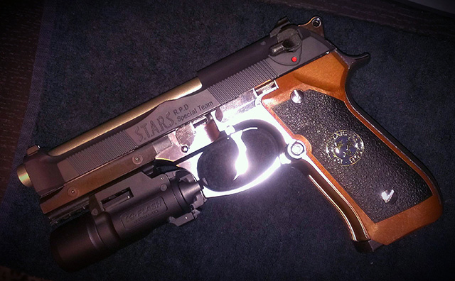 ■投稿タイトル: M92Fカスタム ■投稿者:ゆりあす ■コメント 東京マルイのM92Fのフレームシルバーモデルをベースにサムライエッジのパーツを組み込み製作。社外アンダーレイルをつけてCQフラッシュを装着。バイオハザードのウェスカーモデル風でもあり完全オリジナリティーな感じで仕上げました。