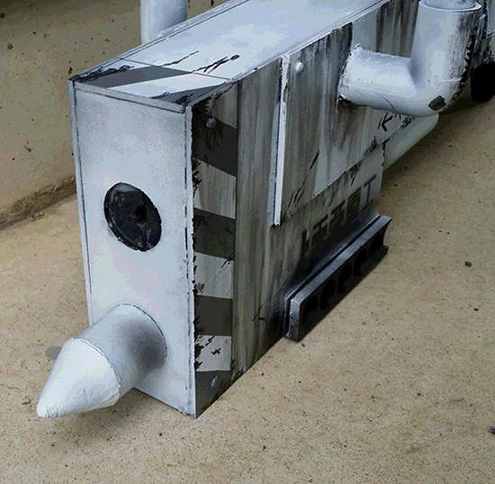 実際はバカデカイ外装に消音材を敷き詰めてMP5に被せたものです。ガスモスカートを使用し、パイルバンカーの発射煙を再現しています。パイルバンカーはTwitterのフォロワーさんからアイディアをいただきました(*^^*)高い消音性と対戦相手へのインパクトを手にいれることができました!