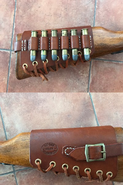 45-70カートリッジが収まっているカートリッジホルダーは革細工で自作しました。