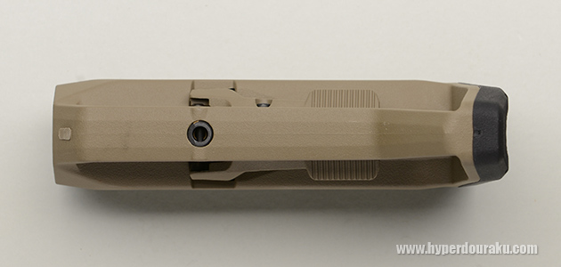 全長、バットプレートもショートスタイルでPDWスタイルのコンパクトカービンによく似合う。後部のスリングループはM-LOK規格になっており、QDスリングマウント等オプション装着が可能。