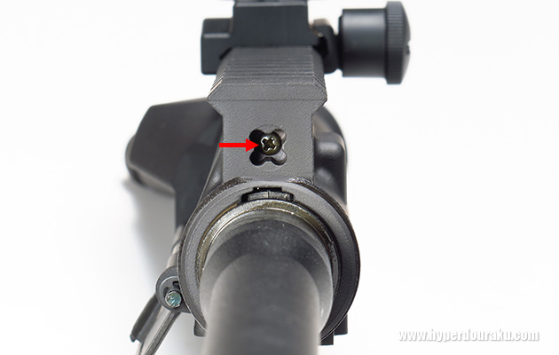 アッパーレシーバーの前面にネジがあります。ここでホップダイヤルが固定されています。アウターバレルの交換などのカスタムでは、ホップを最弱にしてから、このホップダイヤルベースを抜いた方が作業しやすいと思います。