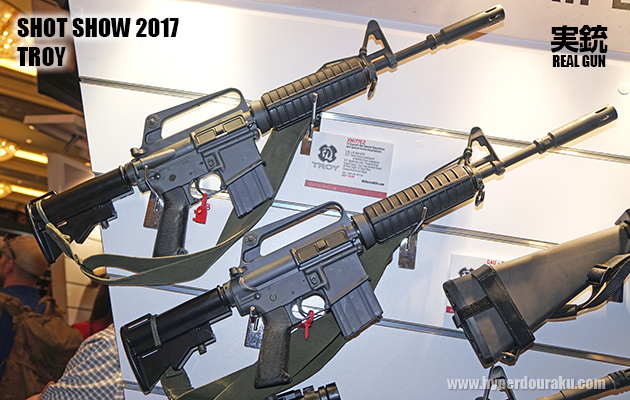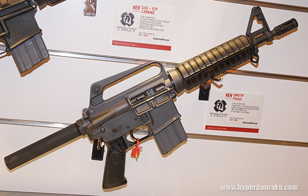 ラスベガスで開催されたSHOT SHOW 2017の米銃器メーカーTroyブースにて展示されていた、XM177E2(上)と、GAU-5/A/A(下)。ベトナム戦争期に使われていたM16系のショートカービンなど、実銃の世界でも懐かしいモデルのリメイクが流行っている。