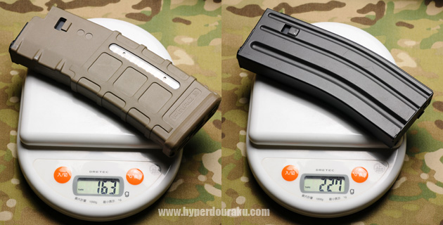 マルイ純正の次世代M4マガジンと重量を比較。純正の227gに対して、P-MAGは163gと60g以上も軽量化できる。