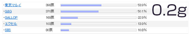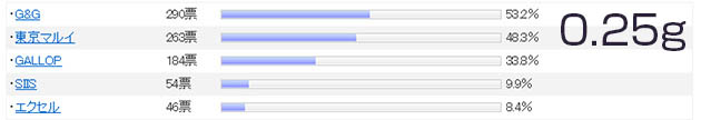 一方0.25gで絞り込むとG&Gが53%、マルイが48%という結果に。GALLOPも10%ほど増えています。