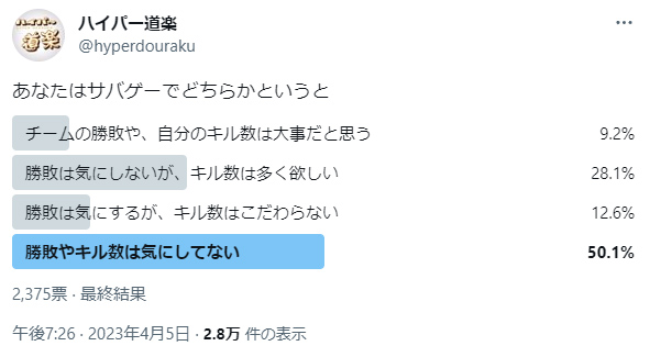 サバゲーにおいて、どれくらい皆さんがチームの勝敗や、ヒット数などの結果を重視するかという内容です。回答数は2375票です。