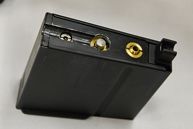 マガジンはグリップの前後に2個装着されている。ブルパップタイプなのでグリップ後のが装弾用。グリップ前方のマガジンは予備マガジンで素早いマガジンチェンジに対応できる。