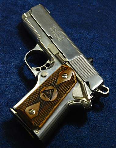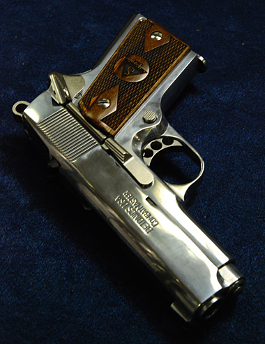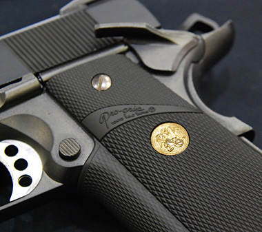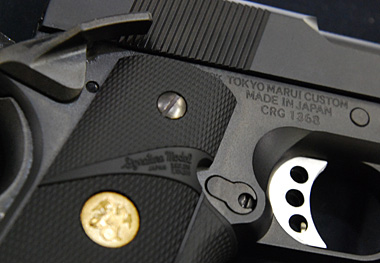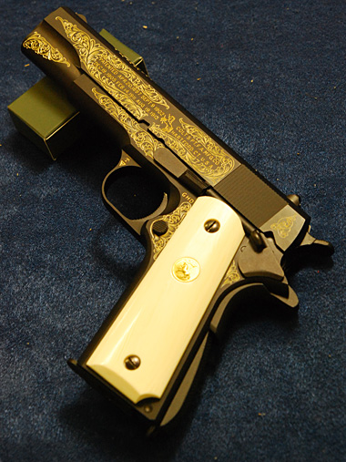 ハイクォリティな削り出しカスタムスライド・削り出しカスタムフレームを使用。重量は800g。特有のシャープなラインは実銃ガバメントそのもの。リアサイトもカスタムパーツ。グリップはアイボリースーパーポリッシュ。手彫りのエングレーブは日本一の彫金師が魂をこめて打ち込んだ。