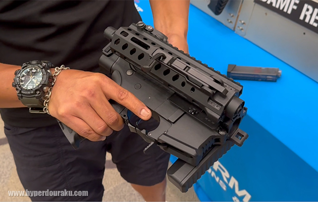 試作品なので実際の動作を見ることはできなかったのだが、チャージングハンドルが左右に好みでどちらにも取り付けが可能。Action ArmyのAAP01アサシンのマガジンも対応しているとのこと。2023年秋頃発売予定。