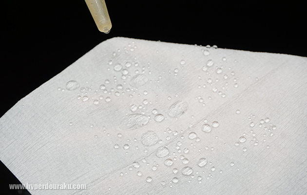 このようにペーパーへと染み込まず、水滴のままそのまま流れていく驚きの撥水力だった。