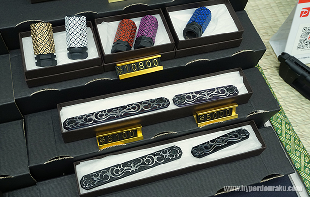 「BoardDragonWorks」では真鍮製ガンアクセサリー「真鍮戦飾」を販売。その中でも今回のオススメは七宝銃口ハイダーのカラーバリエーションに、MAYOZONES のMAYO氏とのコラボでM-LOK用レールカバー「燻銀BMD arabesque rail cover」だそうだ。