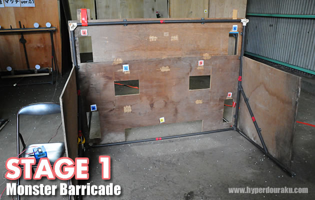 ステージは全部で3コース設置された。ステージ1は「モンスター バリケード」。コの字型のボックス前面に多数の穴が開けられており、ここから前方のターゲットを射撃する。