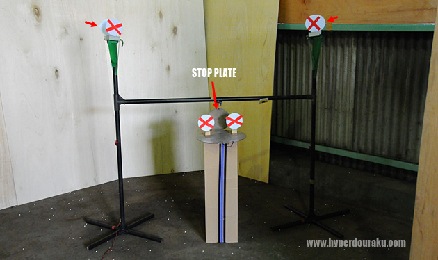 合図とともに振り返って、枠内に入り、左右どちらからでも良いが、上段の4枚のプレートを撃つ。