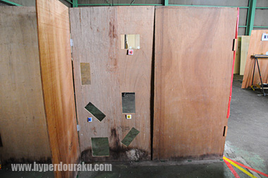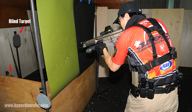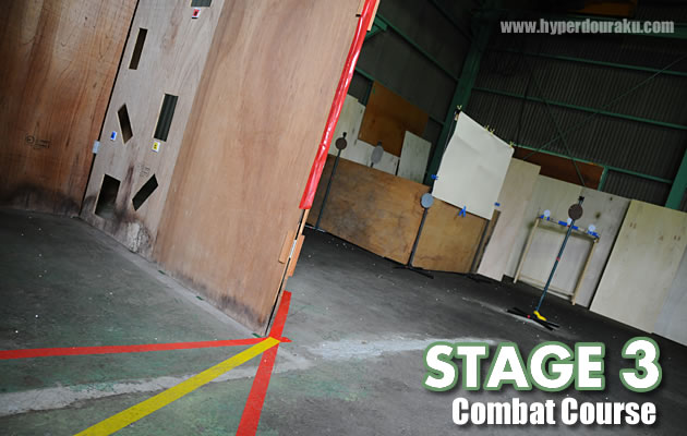 ここがステージ3の難所。ブラインド・ターゲット。走り込んだときに見えた2枚のターゲットの位置を覚えておき、空間把握しながら目隠しされたペーパー越しに撃つ。戻ってターゲットの位置を再確認しても良いが、当たるまで進めない。ここで数分撃ち続けたり、弾を撃ち尽くすシューターもいたほど難しかった。簡単そうで難しい。