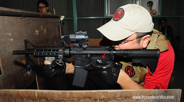 トモさんはスイッチして射撃。左手の親指を矢印のようにしてセレクターを操作している。