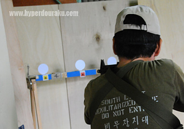 くるりと振り返って、ボックスの中に入り、1番から7番まで示された穴から順番に撃つ。
