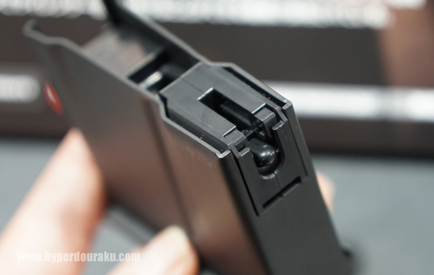 マガジン装弾数は30~50発の予定でおそらく35発になりそうとのこと。給弾方式も従来のVSRや96ともことなり、BB弾に負荷がかからないスムーズな給弾方式「BBロード(仮称)」と呼ばれるものになっている。