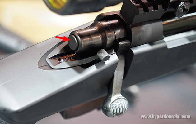 コッキングインジケーターを装備。コックすると矢印の部分が出っ張る。写真はコックされた状態。