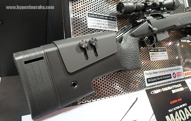 ストックはマクミラン製の実銃採寸。樹脂製のチークパッドは上下に調節可能。バットプレートは4枚のスペーサーで厚みを調節可能だ。また、ハリスタイプのバイポッドや新型スコープの発売を匂わすコメントもあった。