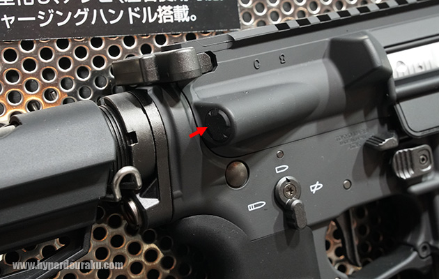 前回のマルイフェスティバル4の展示モデルと大きな変更はないが、リコイルスプリングアッシーがテイクダウン時に飛び出さないよう、矢印の部分にストッパーピンが付いた。