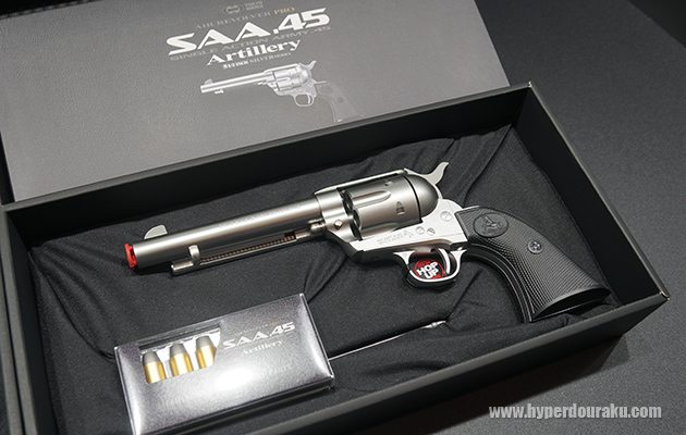 10歳以上対象のエアコッキングリボルバー、SAA.45。ブラックはすでに発売済みで、シルバーが近日発売予定。価格は12800円(税別)。