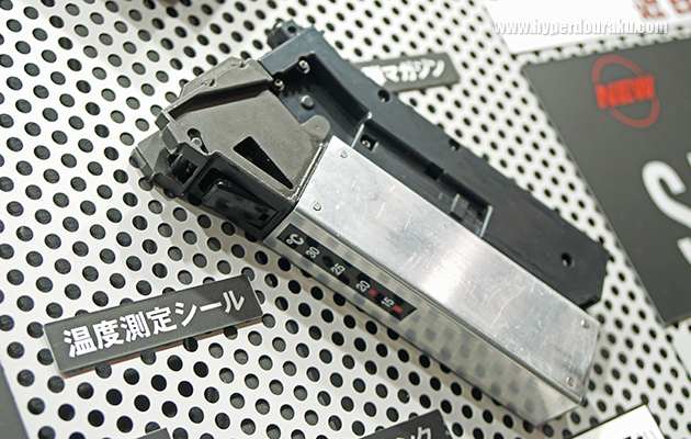 内部には温度測定シールが貼られていてマガジンの冷え状態の目安になる。マガジン装弾数は45発なので、15ショット可能。