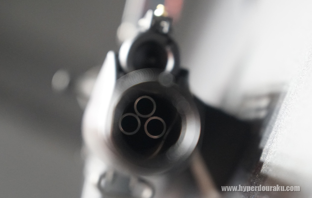 マズルから覗いてみると3つのアルミ製インナーバレルが見える。真鍮製かアルミ製かの判断って何でしているのか聞いてみたところ、やはり原価が違うようで、3本必要なショットガンということもあって、アルミ製になったのだそう。ただし、マルイとしてはアルミと真鍮で特に命中精度は変わらないという認識だそうだ。インナーバレル長は300mmとのこと。