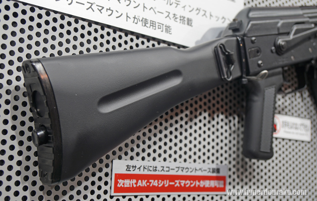 ストックはAK74MNでも見られた樹脂製フォールディングタイプ。一応74とは別パーツとのことで、仕上げのシボの具合も少し違うようだ。