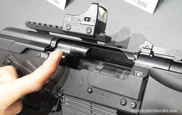 スタッフさんにボルトを開けてもらった。フルストロークではないが、結構後退する。サイガ12Kは3発同時発射のガスブローバックガンで、固定ホップ方式。0.25g弾に最適化されているそうなので、0.2g弾だと少し浮き上がり気味になるとのこと。ストレートホップ式を採用しているので、3発が同じようにホップが掛かって真っ直ぐ飛んでいくそうだ。
